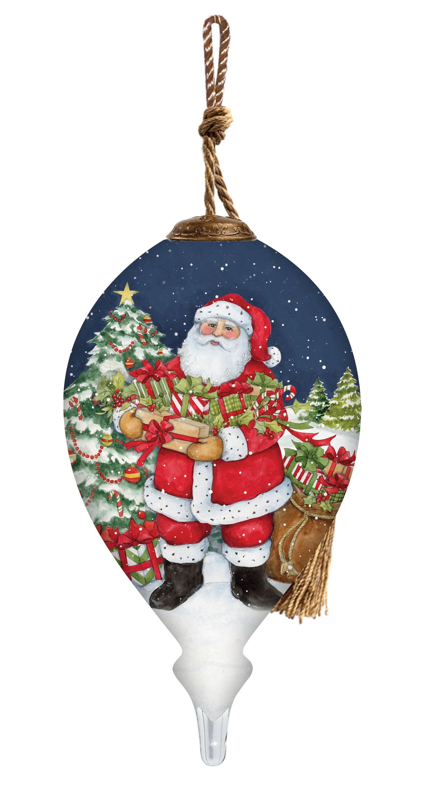 Bring home the magic of Christmas with this hand-painted glass ornament featuring Santa Claus joyfully carrying presents by a glowing Christmas tree. Designed by renowned artist Susan Winget, this heirloom-quality piece is painted from the inside out using the centuries-old reverse painting technique.