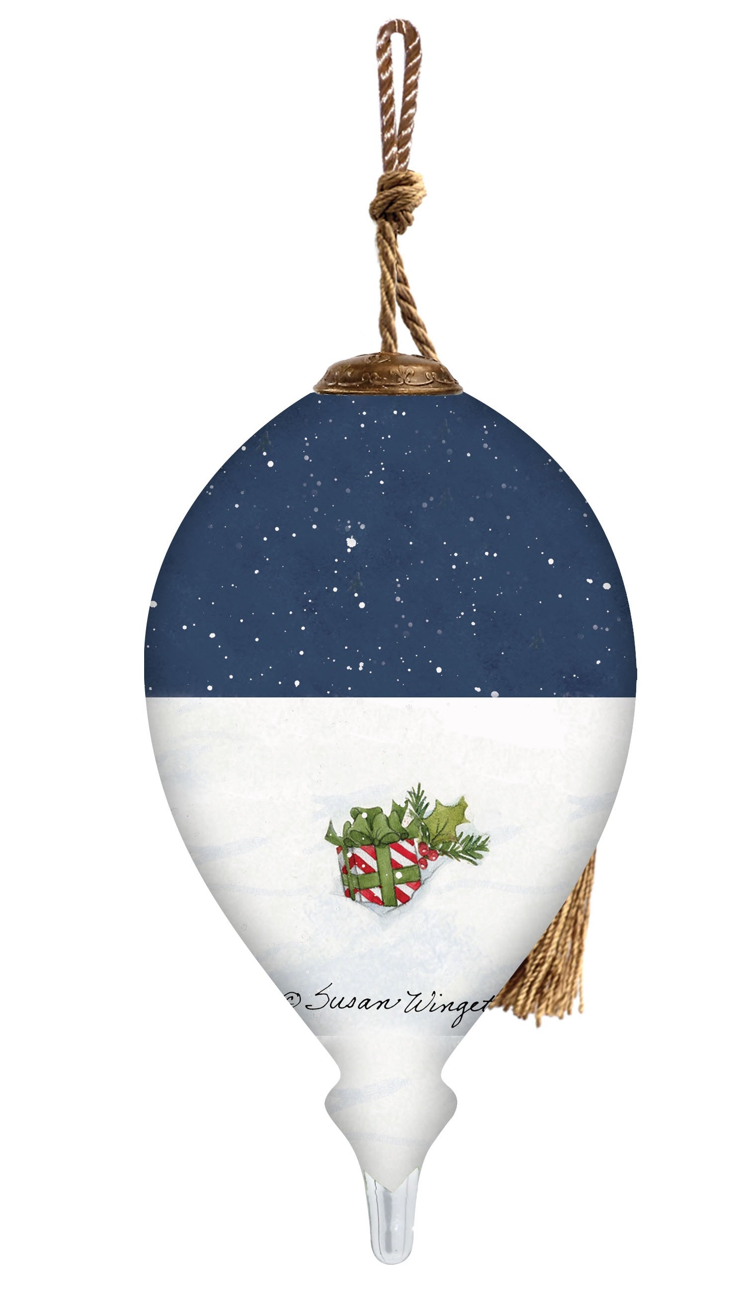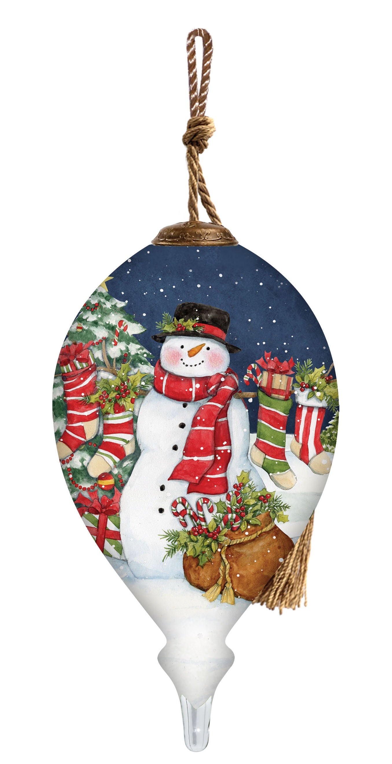 Bring home the magic of Christmas with this hand-painted glass ornament featuring Snowman joyfully carrying presents by a glowing Christmas tree. Designed by renowned artist Susan Winget, this heirloom-quality piece is painted from the inside out using the centuries-old reverse painting technique.