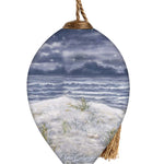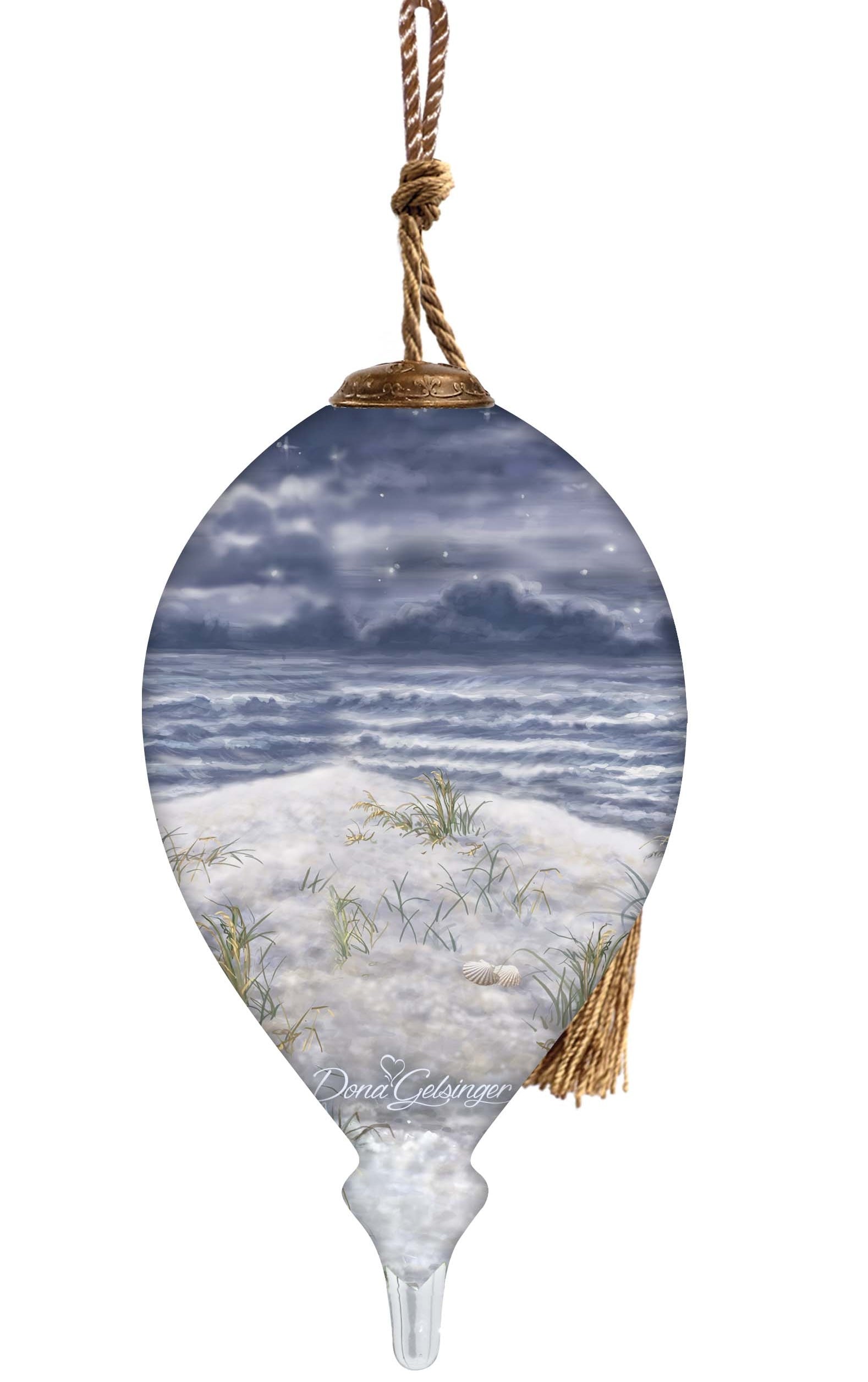 Escape to a serene coastal holiday scene with our hand-painted "Moonlit Beach with Santa's Sleigh" glass ornament. Featuring two festive chairs adorned with wreaths, overlooking a moonlit ocean with Santa's sleigh soaring across the sky, this ornament captures the magic of Christmas by the sea. Perfect for gifting or adding a unique touch to your holiday decor. Order today!