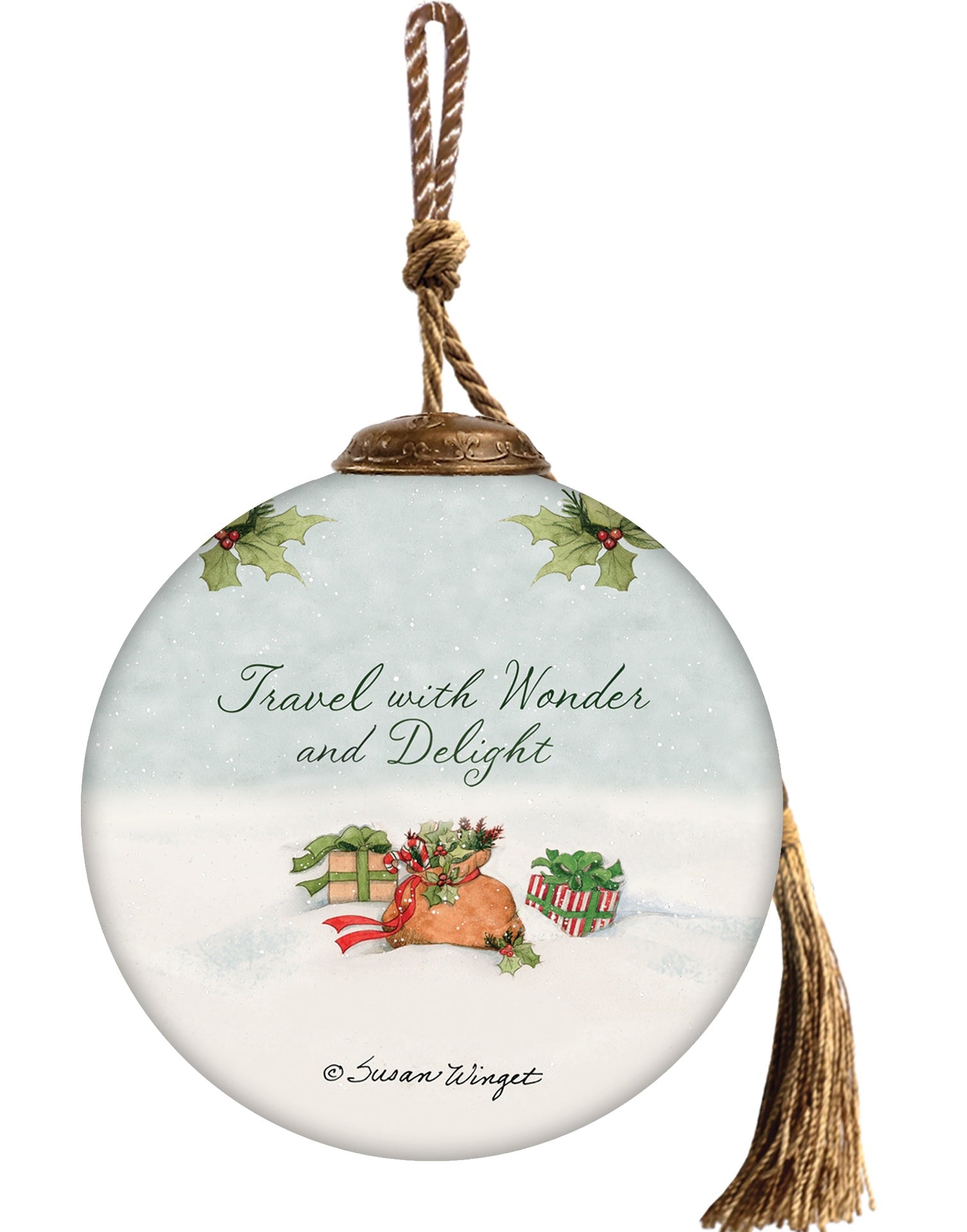 - Design: This ornament features the best licensed original artwork of artist ©Susan Winget. An adjustable antique gold-colored cord with tassel provides a beautiful and easy way to hang each ornament on a Christmas tree or a decorative ornament stand.